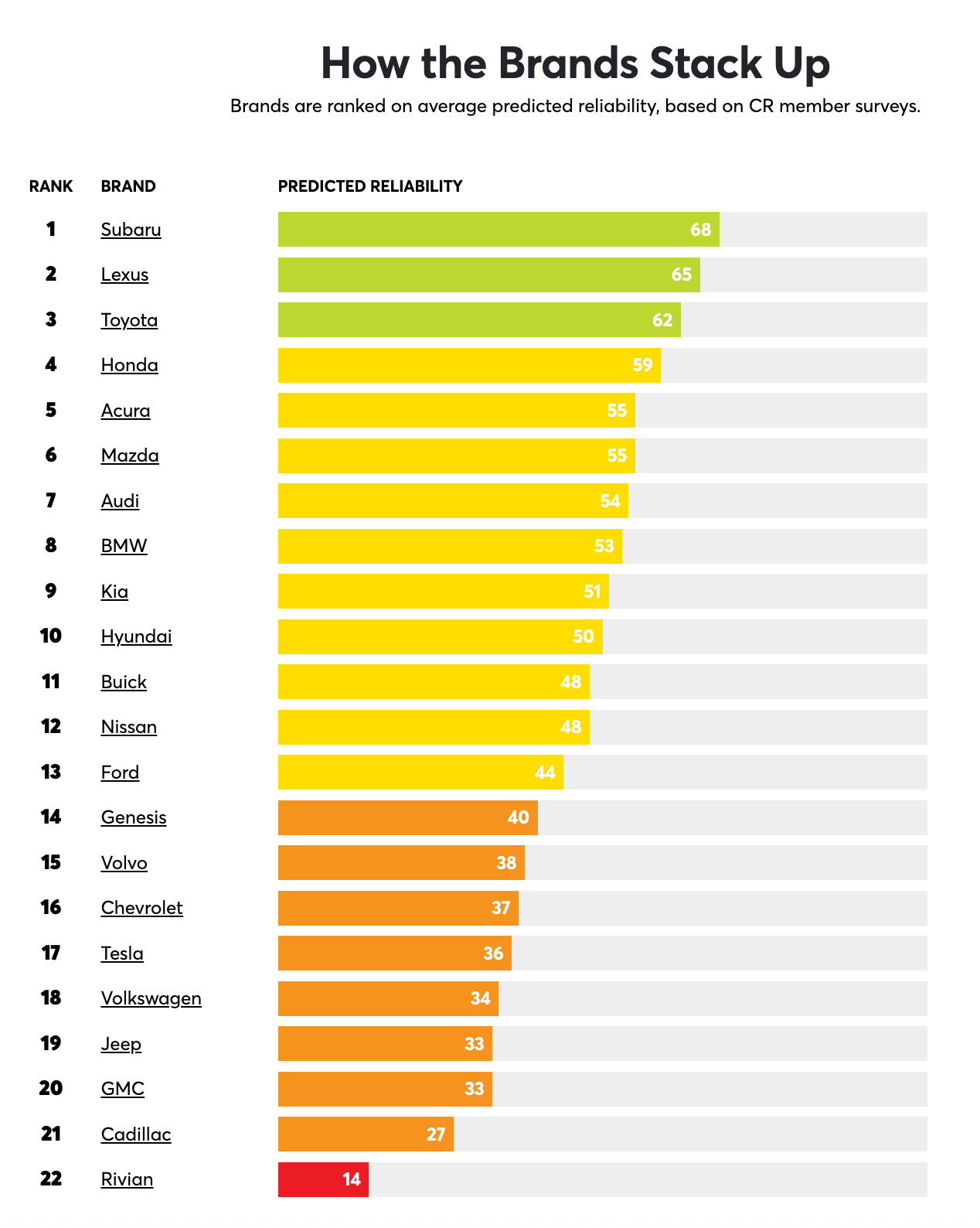 Очікувано перші шість позицій у рейтингу зайняли японські автовиробники. Найвищий бал отримала Subaru, яка обійшла таких давніх лідерів, як Toyota і Mazda. Ці бренди традиційно демонструють стабільну якість, а їхні моделі — мінімальну кількість технічних збоїв упродовж перших років експлуатації.