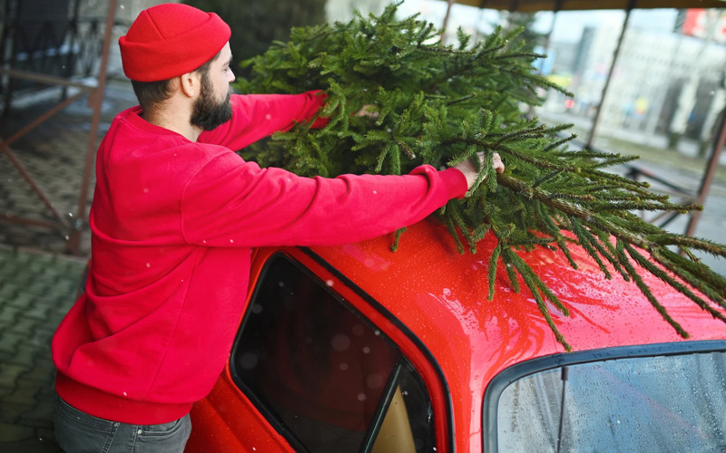 Якщо дерево має їхати на даху, основою є належні рейлінги та транспортні ремені. Перед укладанням ялинки варто покласти на рейлінги ковдру або мат, які захистять лак. Стовбур повинен бути спрямований вперед – це зменшує опір повітря та ризик пошкодження дерева вітром.