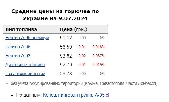 Ціни на бензин та дизельне паливо почали знижуватися, проте незначно. Зокрема, 9 липня середня вартість бензину А-95 преміум залишилася на рівні колишнього торговельного дня – 60,12 грн/л. А-95 знизився у ціні на 1 копійку, до 59,59 грн/л. На 2 копійки подешевшав бензин А-92, до 53,62 грн/л.