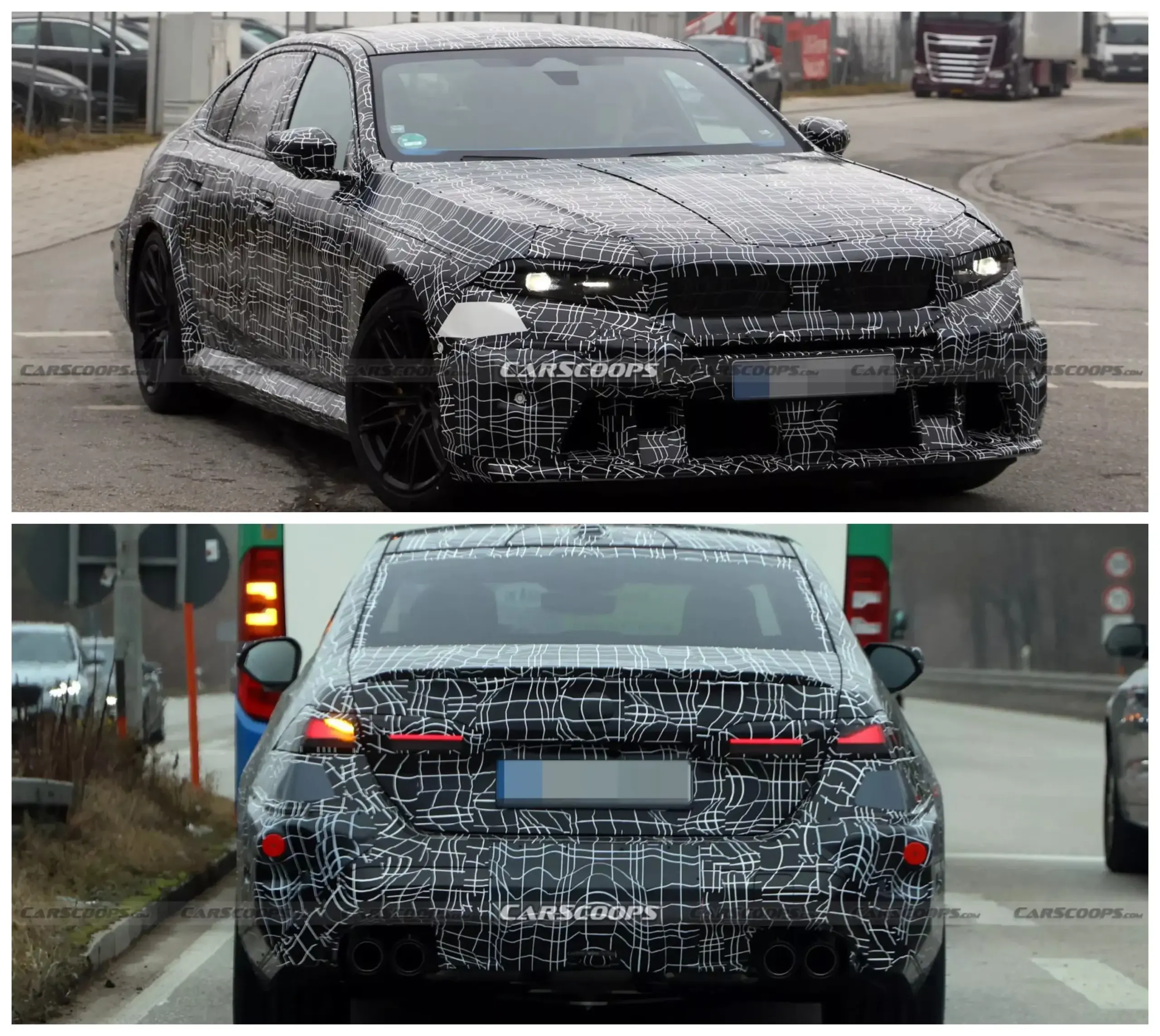 Особливу увагу на шпигунських знімках експерти звернули на фальш-панель у зоні решітки радіатора. На перший погляд може здаватись, що BMW відмовилась від дизайну в стилі Neue Klasse, який був запропонований у концепті. Однак більшість аналітиків вважає, що бренд просто замаскував справжню форму передка. Інші деталі екстер’єру без суттєвих змін – ті ж самі розширені крила, глибокий бампер з великими повітрозабірниками та чотири вихлопні труби.