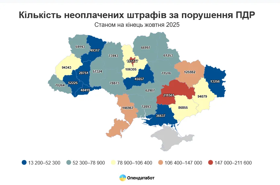 - Регіони-лідери: Лідером за кількістю несплачених штрафів залишається Дніпропетровщина — 211,5 тисяч (11%). Далі йдуть Київ (10%), Одещина (7%), Харківщина (6%) та Київщина (5%).