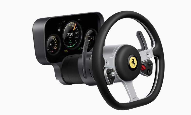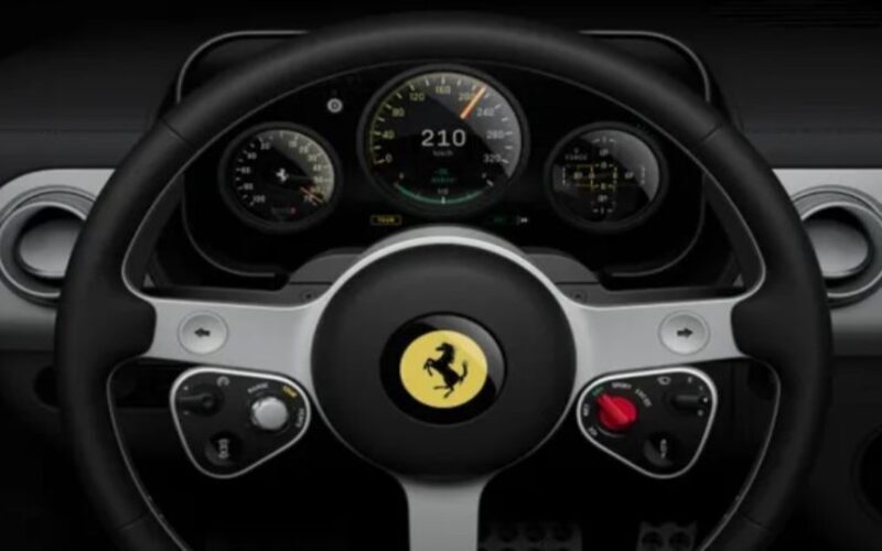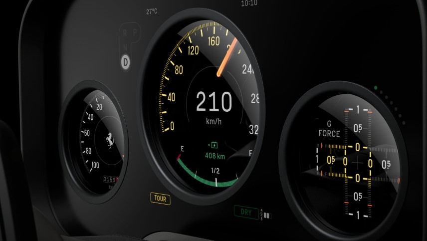 Цифрові прилади створені разом із Samsung на базі OLED-дисплея з ідеальним чорним кольором і ефектом глибини. Дизайн шкал натхненний авіаційними приладами та старими гелікоптерами — виглядає технічно, чисто й дуже «по-Феррарі».