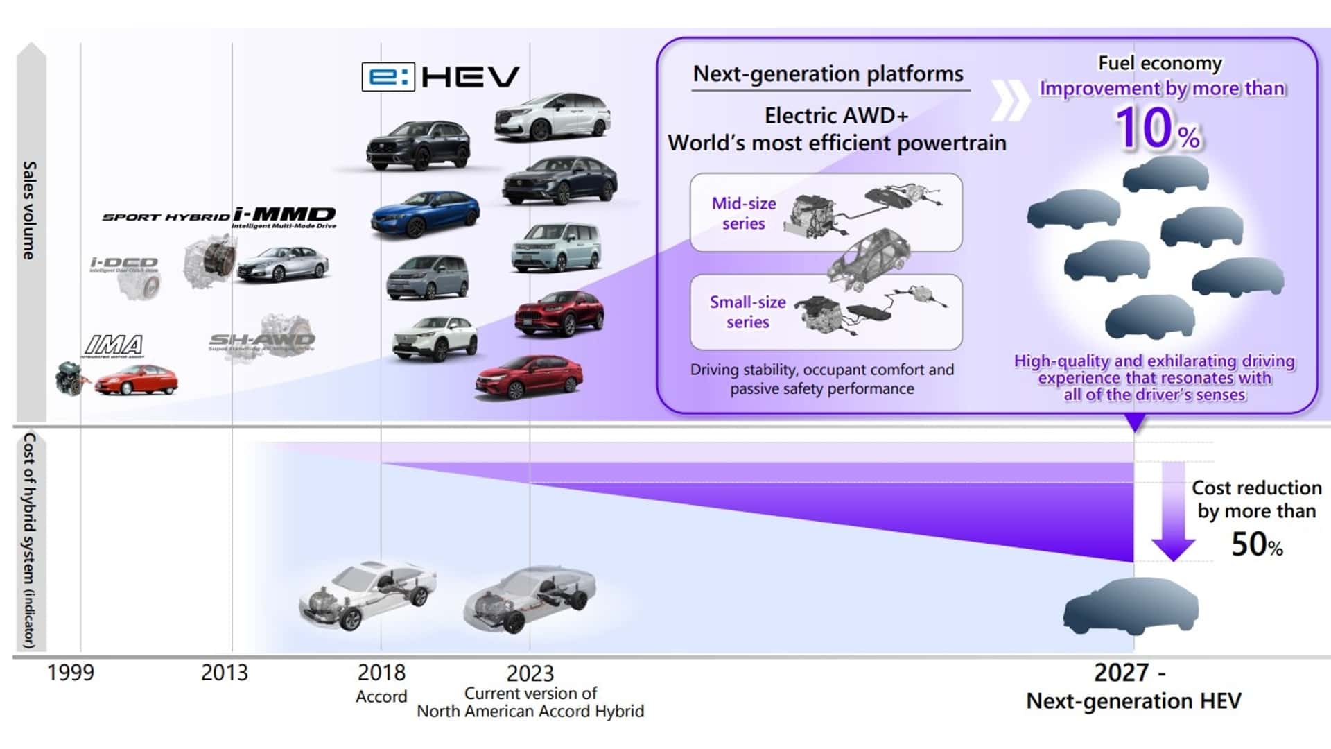 Генеральний директор Тосіхіро Мібе зазначив, що Honda пропонуватиме широкий асортимент гібридних автомобілів у США, від початкового рівня до великих моделей. У лютневих чутках стверджувалося, що Honda намагалася переконати Nissan відмовитися від своєї технології e-Power, що збільшує запас ходу, прагнучи, щоб майбутні моделі Nissan використовували гібридну систему Honda.