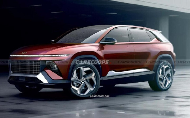 На рендерах “паркетник” може похвалитися наявністю спереду світлодіодної стрічки на всю ширину капота, що імітує рішення, реалізоване в новій Sonata і Staria, а також низько розташовані основні фари.