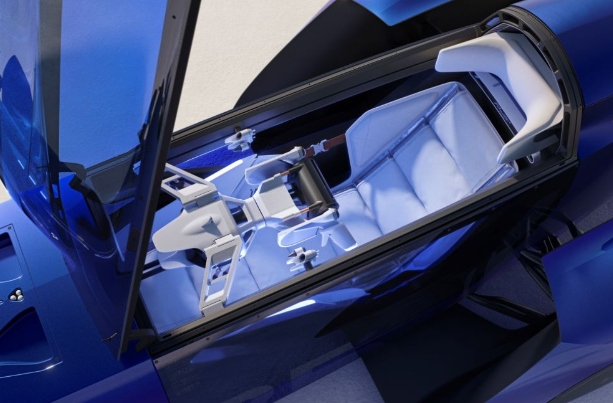 Інтер’єр прототипу також сконструйований під впливом авіації та навіть космічних технологій. Перед пілотом розташований штурвал із додатковими елементами керування та гнучким екраном посередині. Вся конструкція закріплена на відкидному скляному ковпаку, що покращує зручність посадки та висадки. Водій знаходиться в позі, близької до посадки в болідах Формули-1. Причому крісло є гамак з натягнутим на каркас матеріалом. Кліматичної установки немає, але передбачено хитру систему природної вентиляції салону.