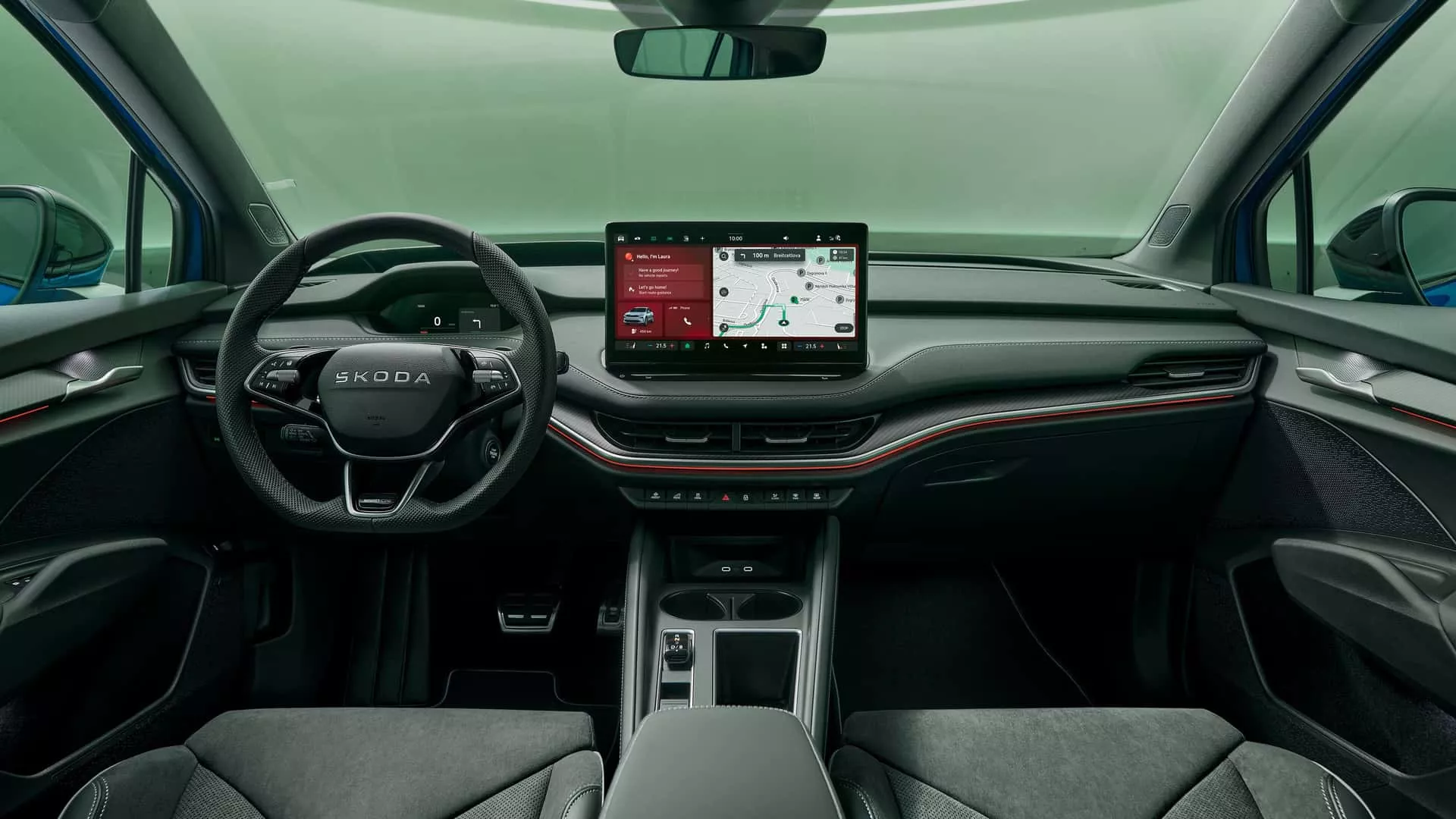 Спереду новий Skoda Enyaq майже схожий на Elroq. Однією з найважливіших змін є те, що Skoda тепер обходиться без решітки. Замість нього є чорна діафрагма («Tech-Deck Face»). Як й на Elroq, напис Skoda замінює логотип бренду.