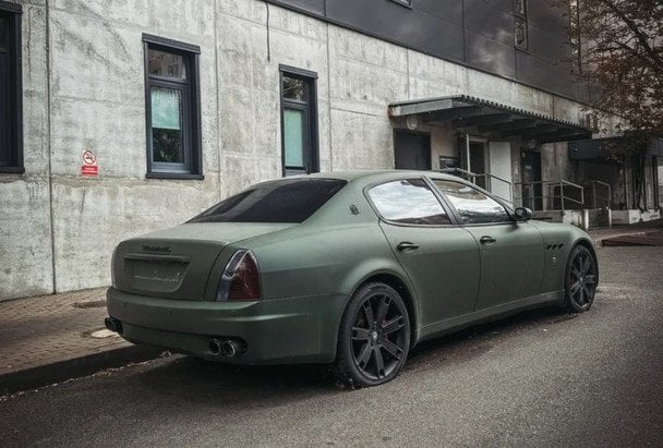 Цей Maserati Quattroporte п’ятого покоління — не просто авто, а заява про статус. Матове зелене забарвлення, 20-дюймові диски та 400-сильний V8 від Ferrari. Але сьогодні, замість реву двигуна, він демонструє лише шар бруду, приспущені шини та дрібні пошкодження. З авто навіть зняли номери, що свідчить про його сумнівне минуле.