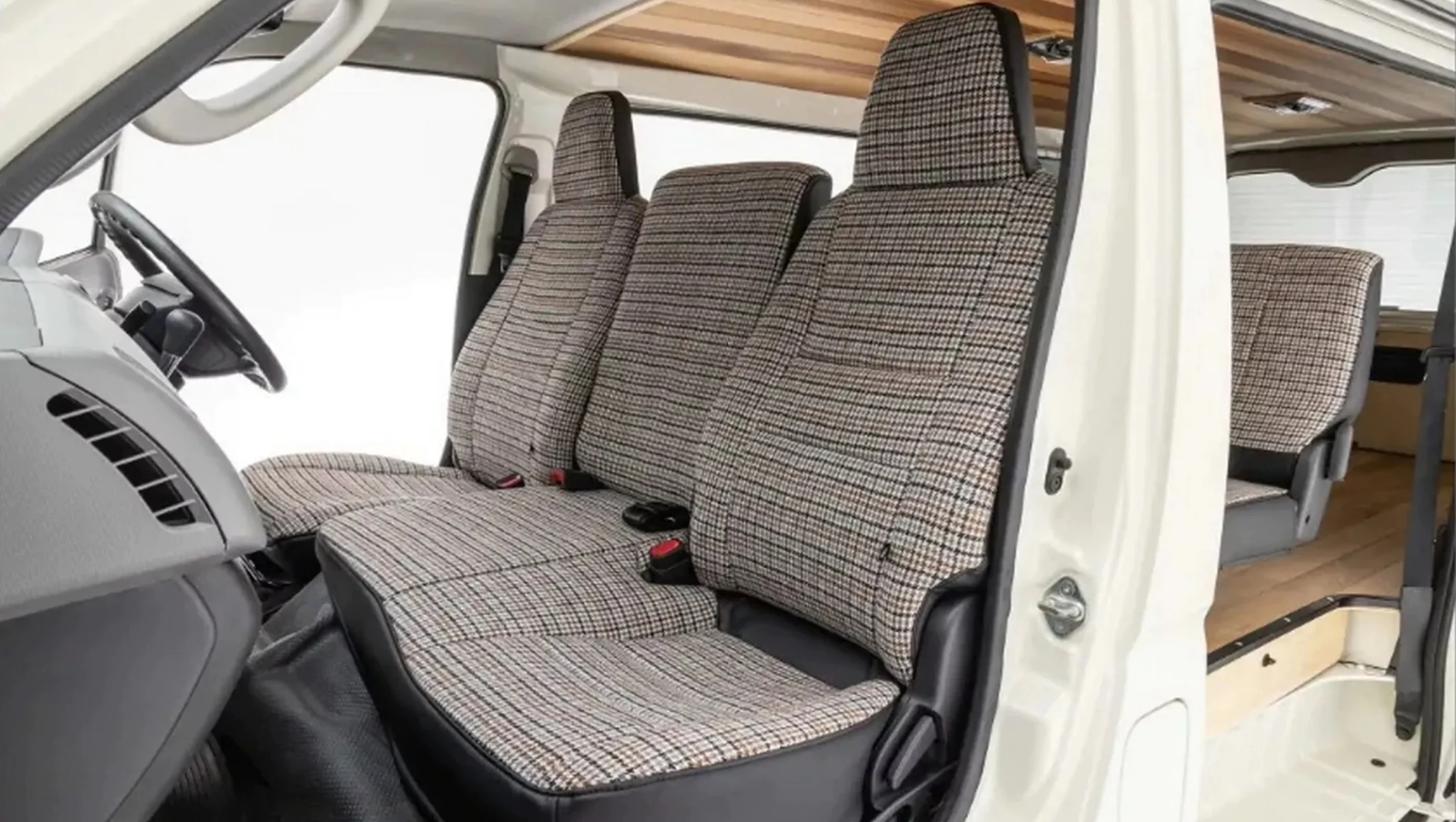 Салон Toyota Hiace H200 отримав особливе оздоблення в стилі 80-х, а підлогу покрили ламінатом. Крім того, встановили вінтажні кермо та важіль КПП.