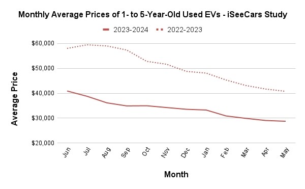 У травні 2024 року різниця в середній ціні між вживаними електромобілями та автомобілями на бензині досягла 8,5% або 2657 доларів США. Середня ціна вживаного електромобіля минулого місяця становила 28 767 доларів, тоді як середня ціна бензинового автомобіля – 31 424 доларів.