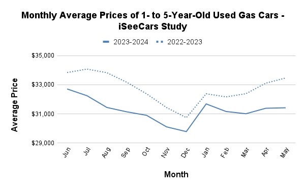 Середню ціну вживаних бензинових автомобілів не спіткала така доля. Вони трималися на рівні близько 31 000 доларів протягом року, змінившись не більше ніж на 7% порівняно з минулим роком, і фактично зросли приблизно на 375 доларів з лютого по травень 2024 року.