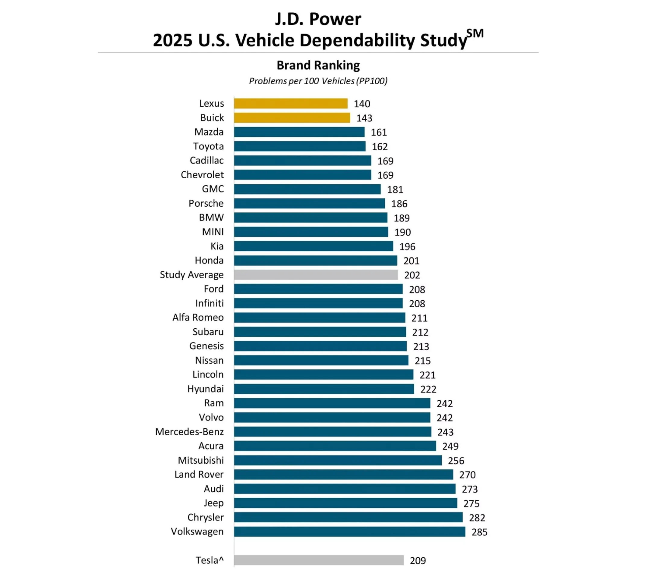 Серед брендів лідирують Lexus (140 проблем на 100 авто) та Buick (143). Також непогані показники – в Mazda, Toyota та Cadillac. У хвості рейтингу – Volkswagen (285), Chrysler (282) і Jeep (275).