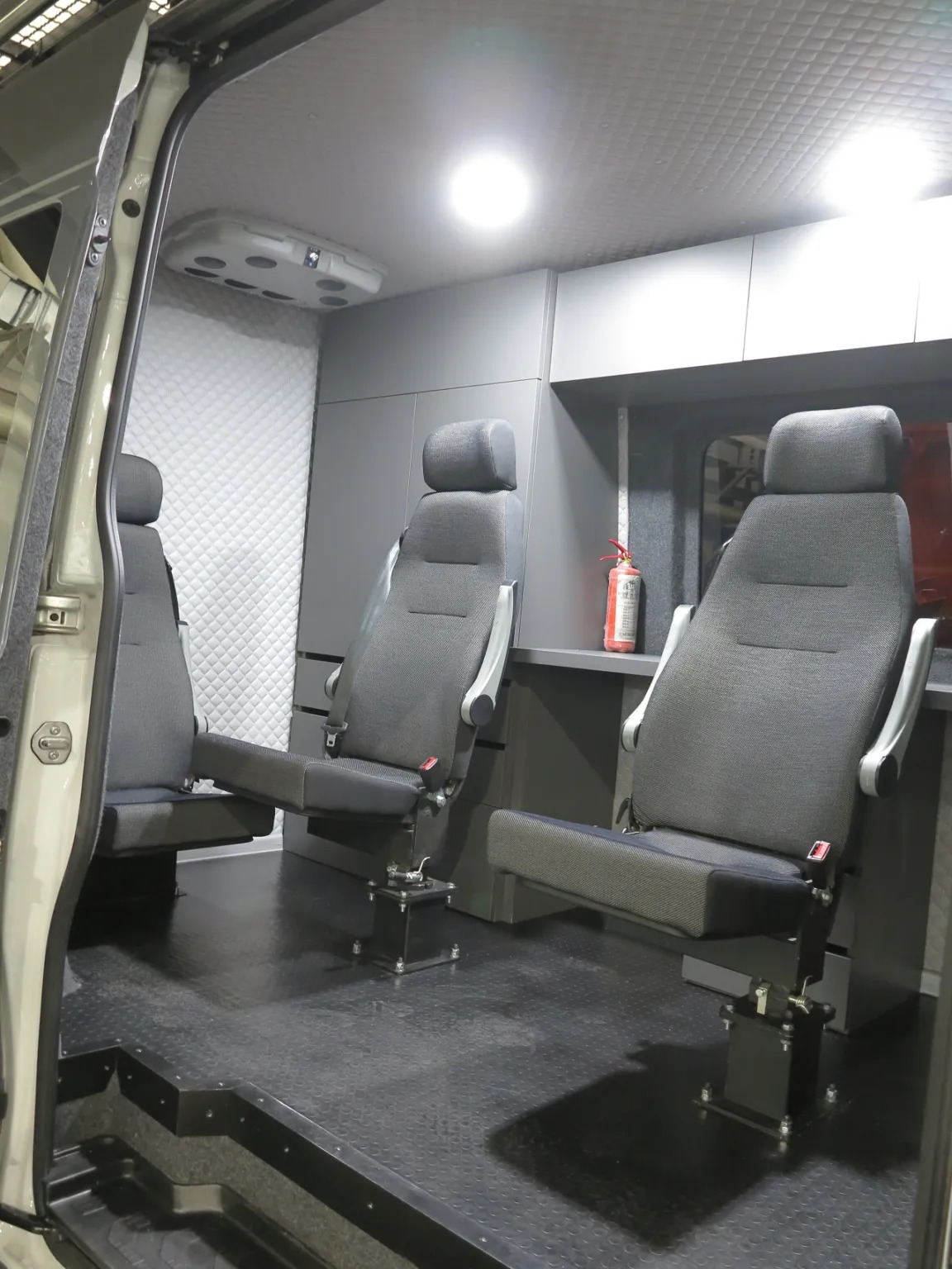 Список виконаних робіт з трансформації досить великий. Установка двох додаткових вікон у пасажирському салоні, шумоізоляція та утеплення, а також монтаж стелі, бічних панелей, LED-освітлення, автономного електричного кондиціонера. Усередині також з’явилися три крісла з підлокітниками, два з яких з поворотною функцією; все – з триточковими ременями безпеки. Було змонтовано робочий стіл для двох осіб, шафи для інструментів та додаткові розетки.