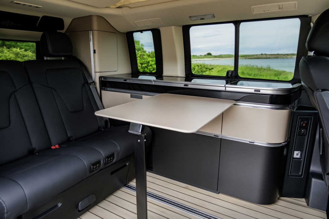 Дім на колесах Mercedes розрахований на чотирьох осіб. Усередині є спальні місця, мінікухня з плитою і раковиною, а також різноманітні шафи. Дах мінівена піднімається.