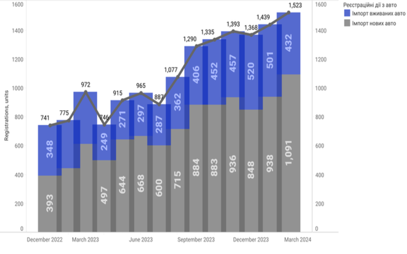 Частка продажів авто з Китаю зростає. Так, у лютому цього року український автопарк поповнився на 1523 автомобілі з китайським VIN, що на 5,8% більше, ніж у січні-2024, та майже удвічі більше, ніж у лютому-2022. Такий показник виявився найбільшим для українського авторинку.