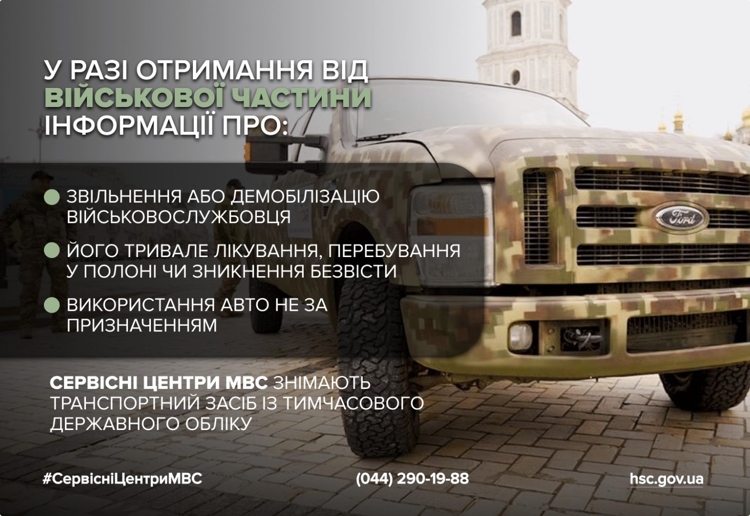 Сервісні центри МВС також знімають авто з реєстрації, якщо надходять повідомлення про демобілізацію, звільнення, тривале лікування, перебування у полоні або використання машини не за призначенням.